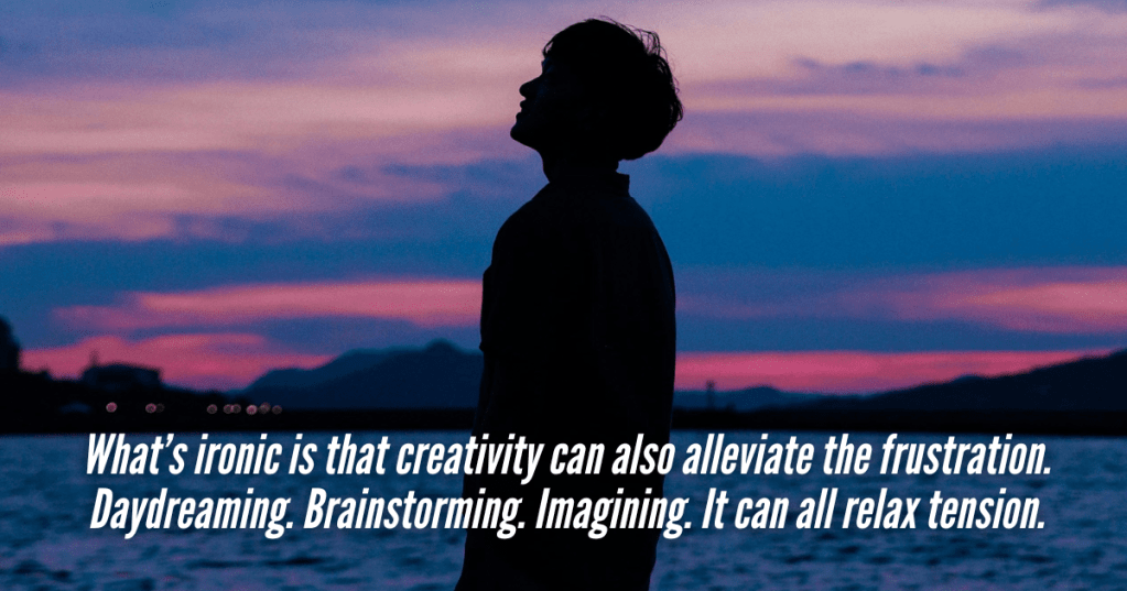 What’s ironic is that creativity can also alleviate the frustration. Daydreaming. Brainstorming. Imagining. It can all relax tension too, and I can do it lying down or in a waiting room. Eventually, I jot down ideas, type out a few sentences, see the word count grow on the bottom of the screen. Any degree of progress helps me feel stronger.